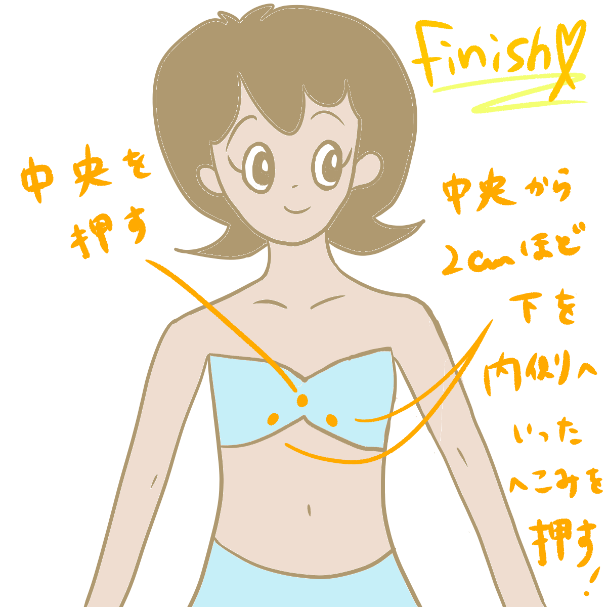 ⑫胸の中央の2㎝ほど下の位置から乳頭へ向かって親指をスライド、へこむところに来たら押す